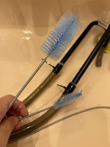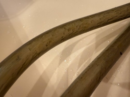 ポンプとクーラーをつないでいた配管にはたくさんの汚れがついています。来年も再利用する場合はパイプクリーナーワイヤーブラシで清掃します。