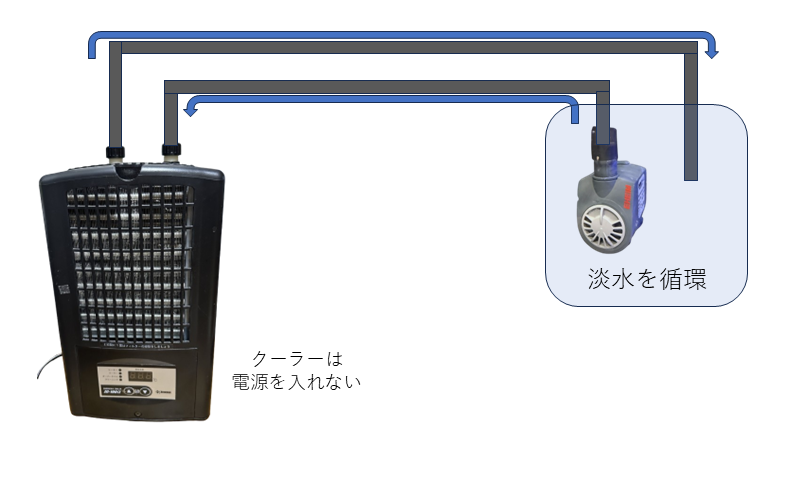 クーポンとポンプを水槽から外したら、真水で1分ほど循環(通水)させます。この際、クーラーの電源は入れないでください。ポンプで水を回すだけです。