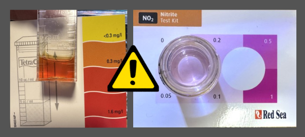 アンモニアが処理され始めると今度は亜硝酸が出てきます。亜硝酸はできるだけ低い濃度まで測定したいところです。アンモニアのときの様な簡易テスター・試験紙では不十分です。おすすめテスターはレッドシーのマリンテストキット硝酸塩/亜硝酸塩です。